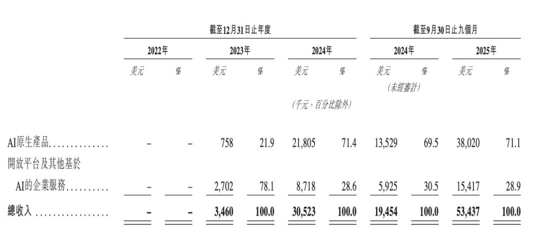 2024年营收涨幅782.17%,主要来自AI原生产品和开放平台及其他基于AI的企业服务。