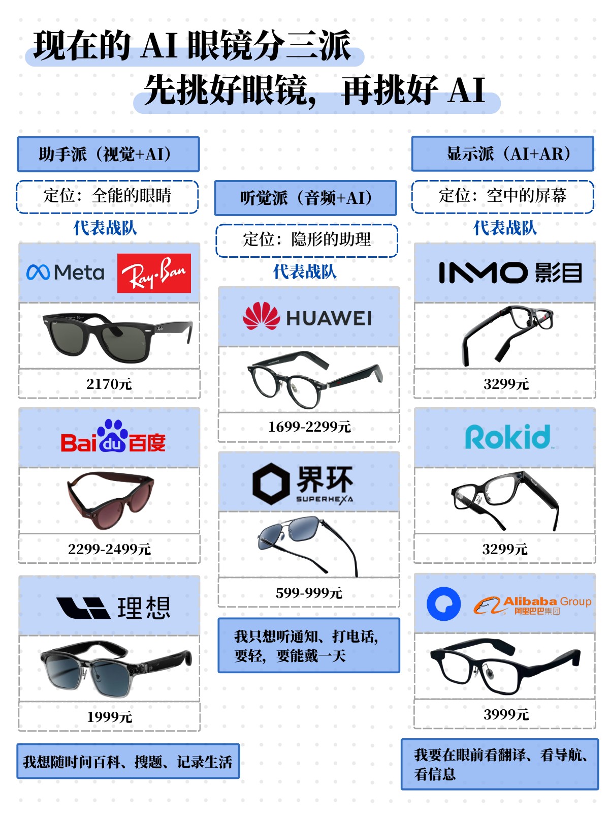 - 摄影/助手派(如Ray-Ban Meta、百度、理想):加上摄像头,主打多模态AI交互与生活记录,是目前的市场主流。