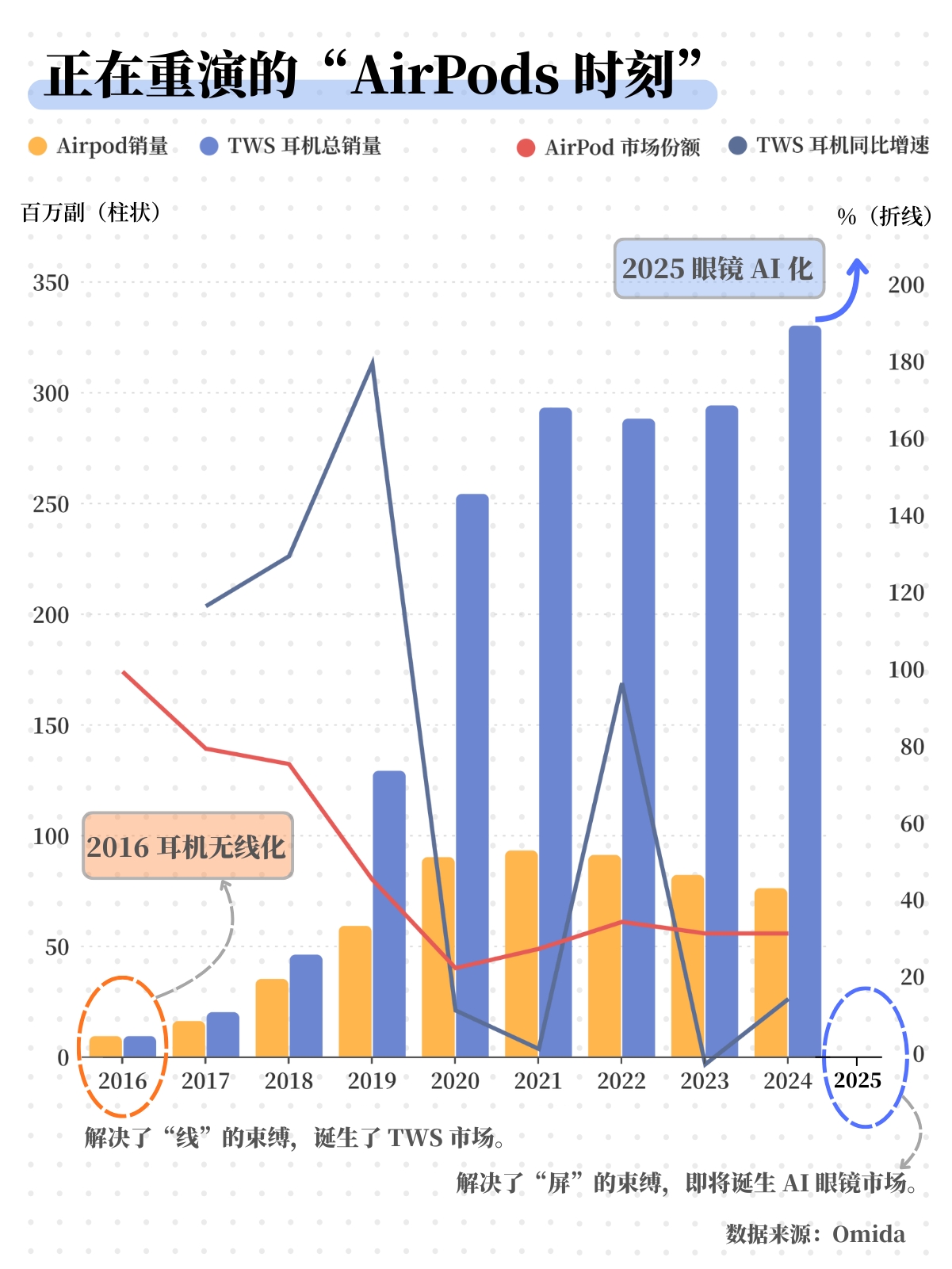 智能硬件的新入口之战已正式开启——AI眼镜正在重演十年前的“AirPods时刻”。据预测,2025年全球AI眼镜出货量将达550万台,同比增长135%;到2030年,这可能是一个出货量达9000万台的庞大市场。