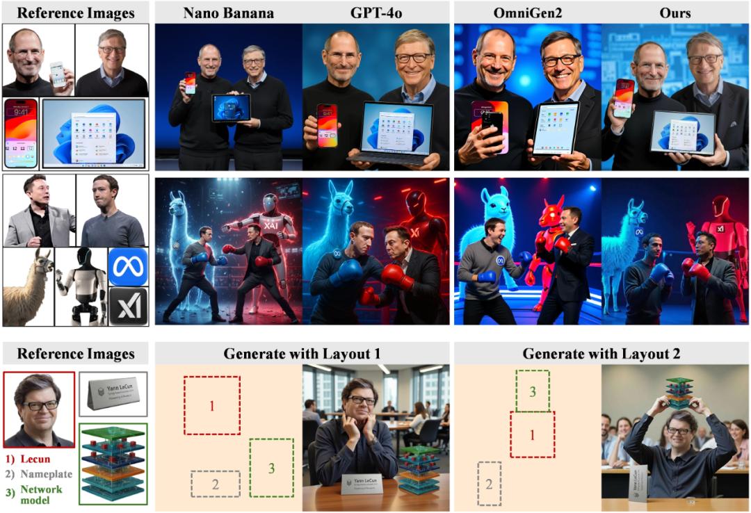 ContextGen在基准测试上,身份保持能力超越SOTA开源模型,并成功对标了GPT-4o和Nano-Banana等强大的闭源系统,实现了在复杂定制化控制方面实现了关键突破。
