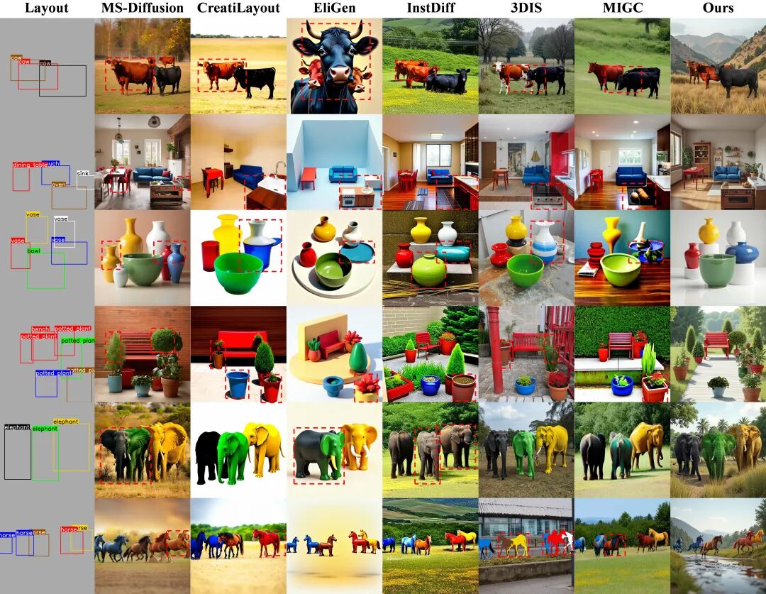 宏观布局难以固化:即使模型显式提供了布局控制功能,生成的多个实例也难以精确地锚定到用户指定的空间位置,属性泄露和实例遗失现象频发,导致生成图像的构图混乱且不符合预期。