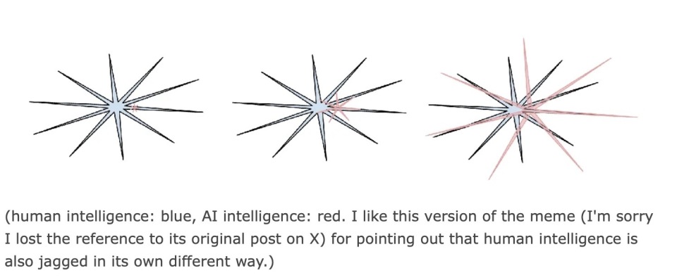 除了技术路径的更迭,卡帕西还对智能的本质提出了深刻见解。他用“召唤幽灵”(Summoning Ghosts)而非“进化动物”(Evolving/growing Animals)来比喻当前AI的成长模式,解释了为何当前的大语言模型会展现出“锯齿状”的性能特征——在尖端领域表现如天才,却在基础常识上可能如孩童般脆弱。