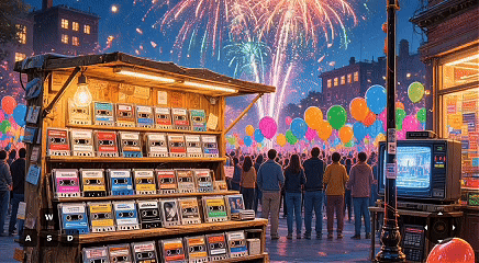 一个热闹的千禧年跨年夜场景,街头有磁带摊,人们举着彩色气球围在广场倒计时,路边门店的 CRT 电视播放着跨年晚会,突然绽放的烟花照亮夜空,复古风格