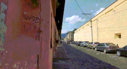当镜头从磁带摊转向右侧的建筑,场景中的物体保持了良好的相对位置关系。路灯、人群和电视机都没有出现明显的漂移或错位,证明模型对三维空间的理解还是不错的。