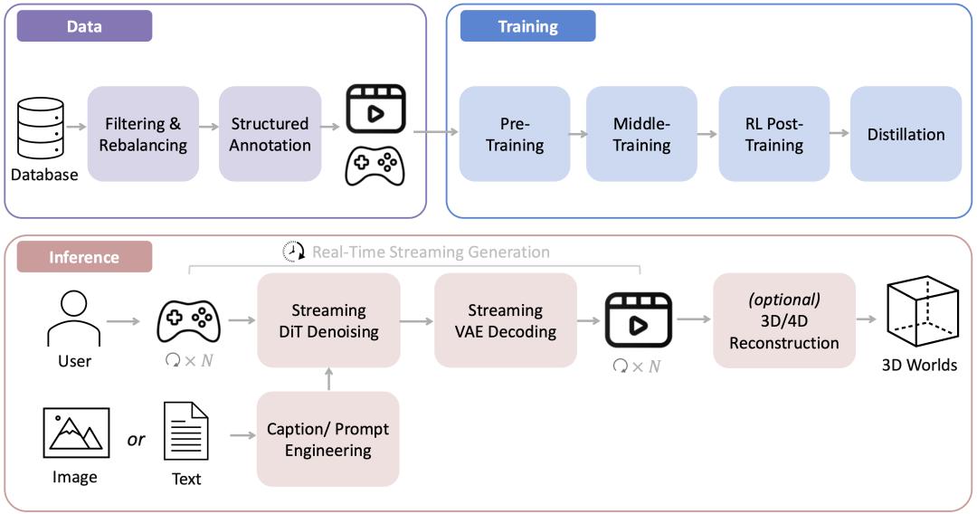 这次采用了流式 DiT (扩散变换器)架构,能像流媒体一样,边接收用户的实时手柄控制信号,边瞬间去噪并解码成画面。这种设计保证了极低的延迟,让你在操控视角时感觉不到卡顿。