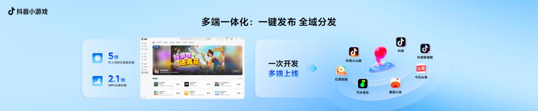 同时,围绕“一个包体,全域分发”的生态扩容方向,平台强调了一次开发、多端上线的分发效率,以及PC端带来的价值放大效应。结合抖音、抖音极速版、今日头条、皮皮虾、番茄小说、红果短剧、抖音火山版等多个分发阵地,小游戏不再被局限在单一场景中,而是通过统一包体覆盖更多用户触点,把增长做成平台级的持续扩容。