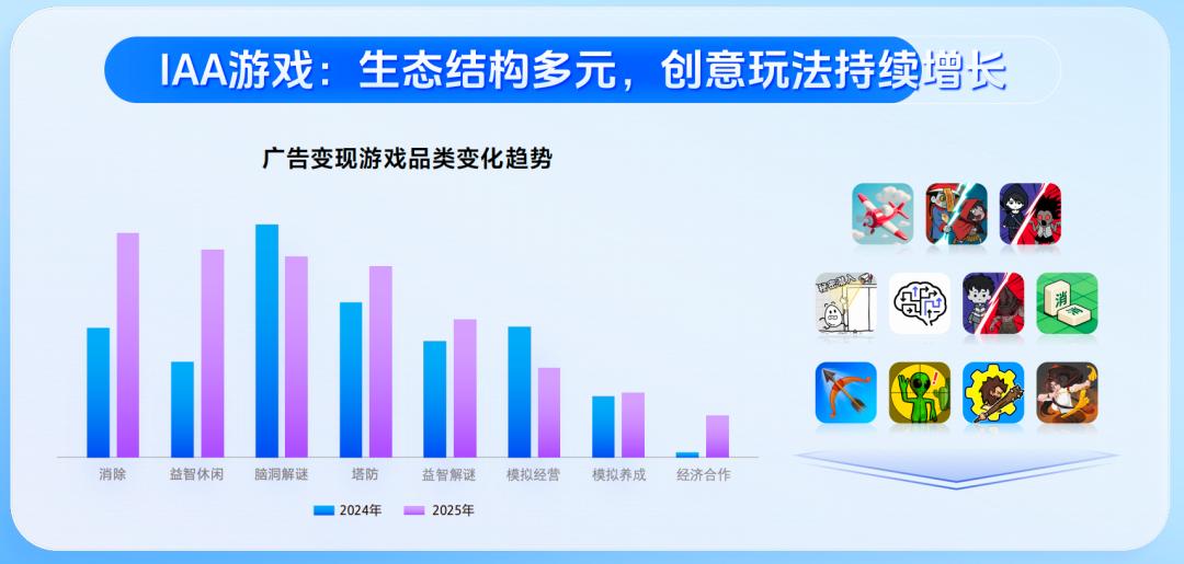 大会现场透露的信息显示,今年抖音IAP小游戏中,RPG、休闲模拟、塔防、SLG四类游戏实现快速增长,成为IAP赛道的核心驱动力,整体呈现出多元化发展格局。