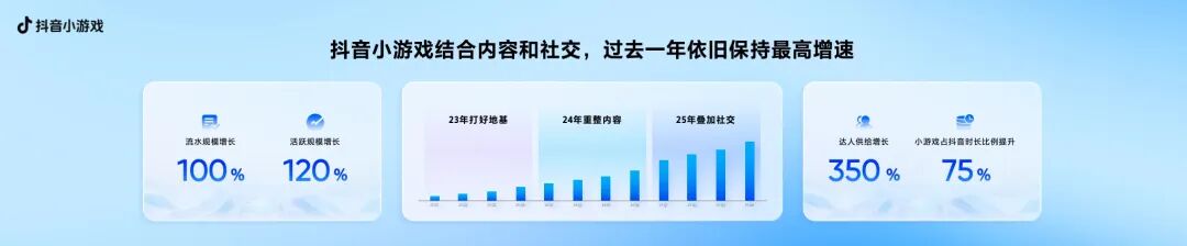 抖音小游戏生态各项核心数据均呈现爆发式增长态势。其中,流水规模增长100%、日活跃用户(DAU)同比增长120%、达人供给增长350%、小游戏占抖音时长比例增长75%。