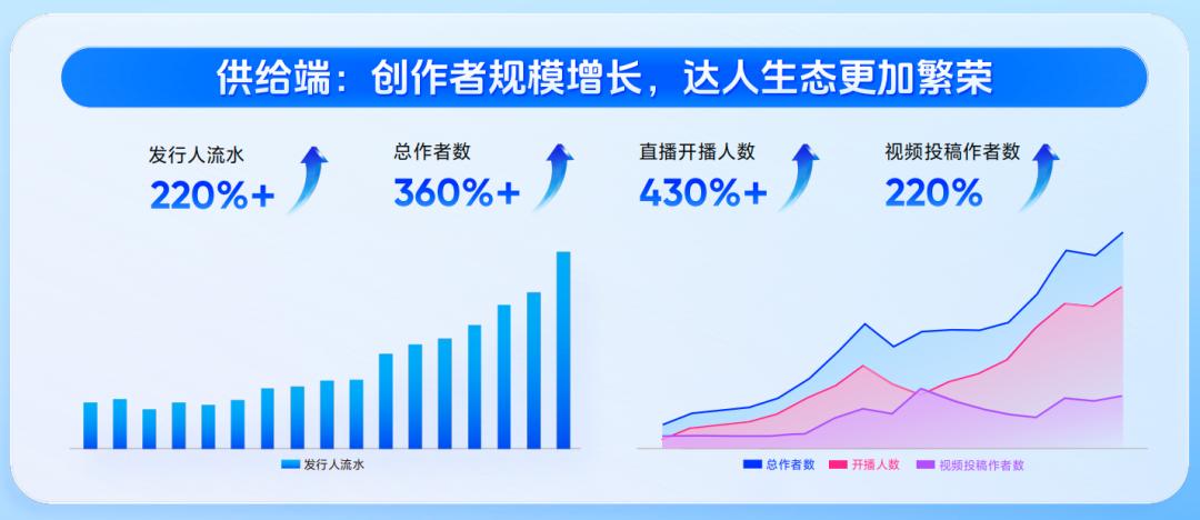 此外,在供给侧发行人流水增长 220% ,总作者数增长 360% 。整体呈现规模增长趋势,达人生态更加繁荣。