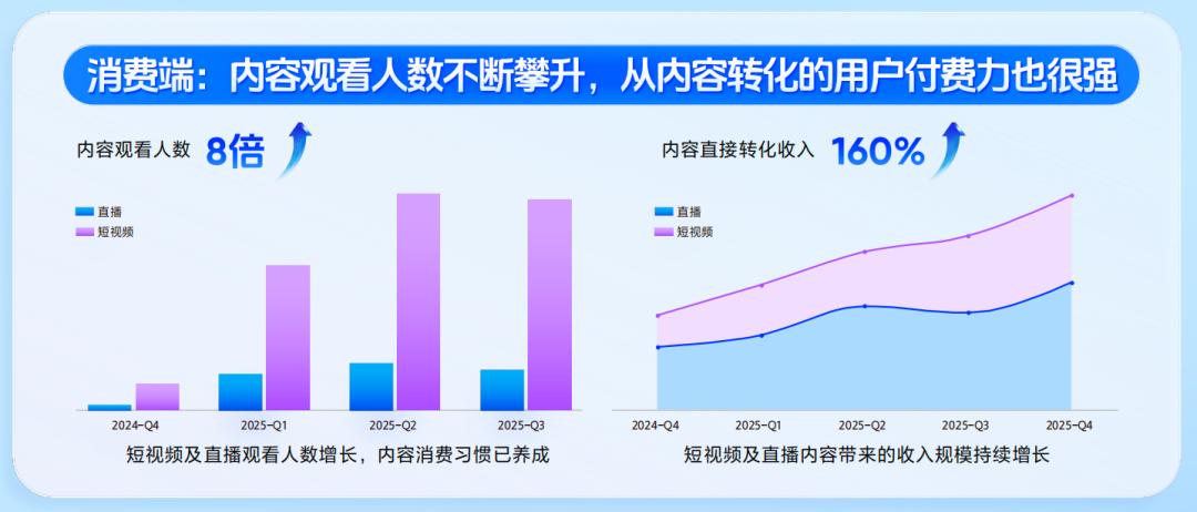 抖音平台数据显示,在消费端,内容观看人数约增长8倍,从内容转化的用户付费力同比增长160%。