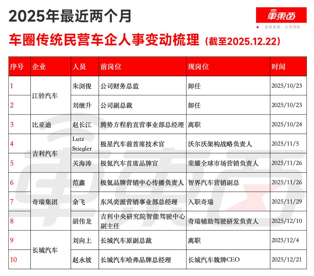 ▲最近俩月传统民营车企人事变动梳理(截至2025.12.22)