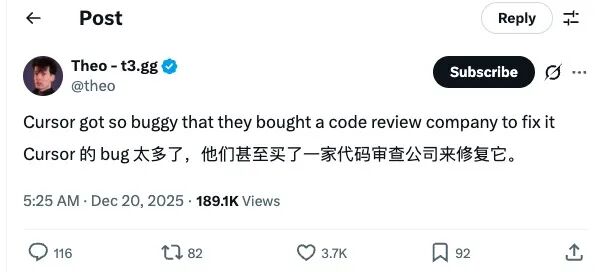 也正是在这个语境下,他抛出了 X 上的那句调侃:“Cursor 的 bug 太多了,他们买了一家 code review 公司来修它。”