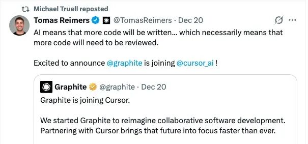 12 月 19 日,Cursor 宣布将收购代码评审初创公司 Graphite。