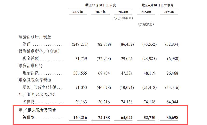 招股书显示,主线科技正迎来流动性挑战。截至2025年上半年末,主线科技的现金及现金等价物较2022年底的1.2亿元大幅缩水约75%。与此同时,公司经营活动现金流持续为负。这意味着,在缺乏外部资金的情况下,公司的日常运营将面临压力。