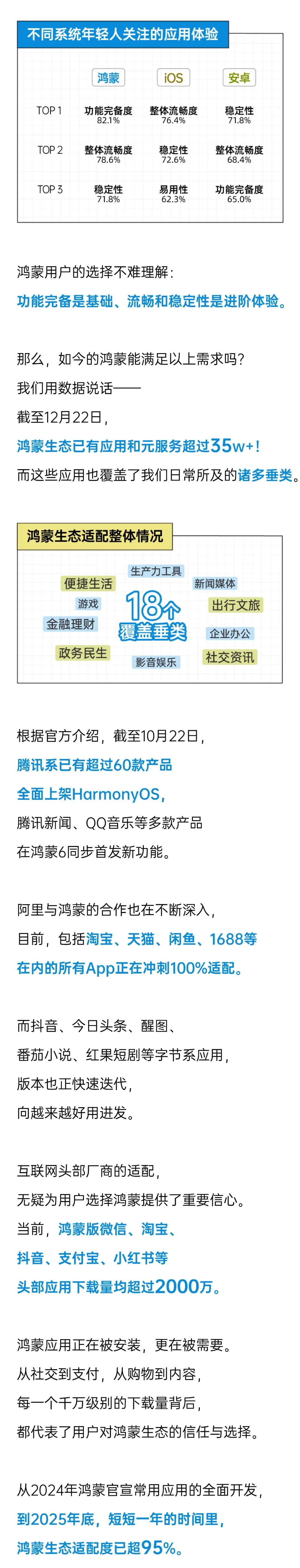 鸿蒙生态正在用越来越丰富、越来越完整的应用生态,回应这届用户越来越细致的体验标准。未来会如何,我们都没有标准答案,但可以确定的是,鸿蒙系统及生态具备持续进化的能力,这两年间,生态体验上的巨大跃升,已经证明了它正向成长的发展潜力:用户的体验反馈、期待将不断推动着生态的迭代和创新,鸿蒙和生态伙伴携手将为这届年轻人带来更多新鲜的App体验!