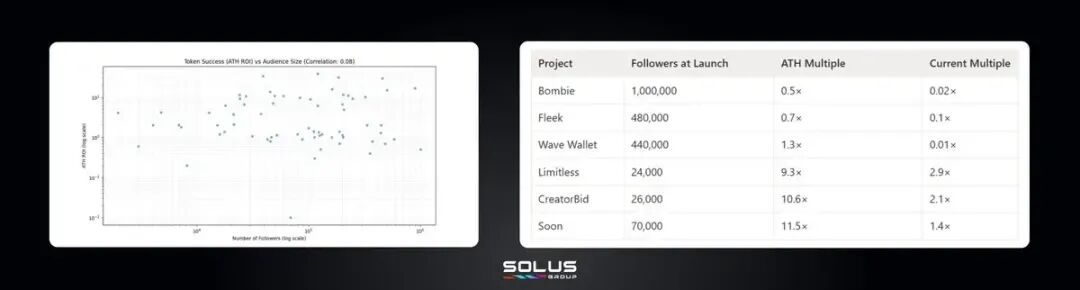 数据显示,受众粉丝规模对代币表现没有任何预测价值,拥有庞大粉丝群的项目表现参差不齐——有的暴涨,有的暴跌,受众规模小的项目也一样,没有趋势,没有规律,也没有相关性。