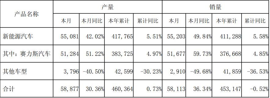 其中,赛力斯汽车月产量5.13万辆,同比增长51.22%;月销量5.17万辆,同比增长59.73%。