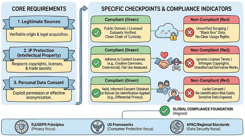 人工智能训练数据的合规架构源自《生成式人工智能服务管理暂行办法》(2023年8月)——这是全球首个专门针对生成式人工智能的行政法规。训练数据必须来自合法来源,不得侵犯知识产权,且涉及个人信息时,必须获得同意或依据《个人信息保护法》提供法律依据。最初严格的“确保”数据质量要求已显著放宽为“提高”数据质量——这体现了对大规模实施挑战的务实考量。