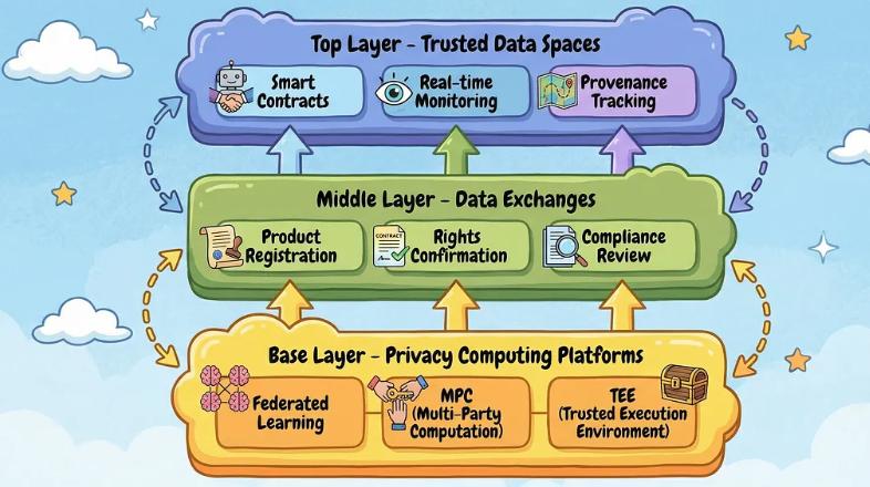 中国的数据基础设施运行遵循一个关键原则:在不暴露底层记录的情况下对数据进行计算。实现这一目标的技术架构包含三个集成层。