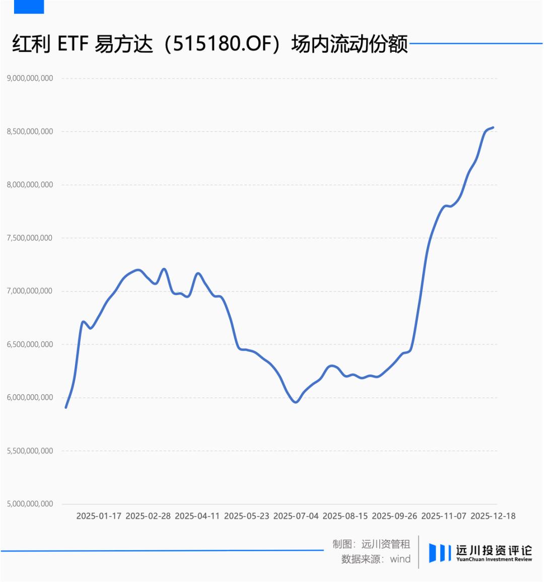 尤其是从下半年开始,今年整体表现相对跑输的红利资产重新开始获得市场的关注。以红利 ETF 易方达(515180)为例,仅四季度以来,净流入资金就超过 30 亿,管理规模突破百亿。截至 2025 年 12 月 19 日,红利 ETF 易方达的资产规模已经达到了116 亿元。