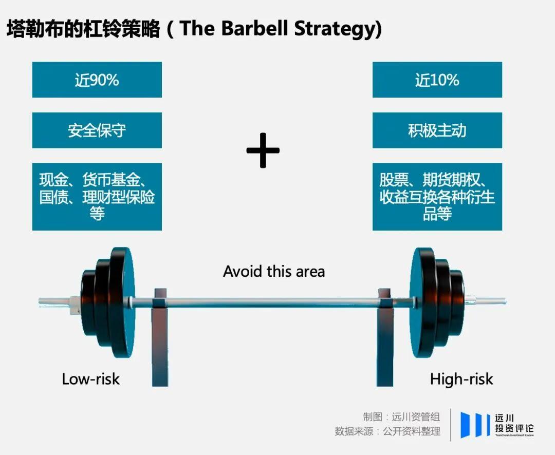 “杠铃策略”这一概念,最早正是出自塔勒布的著作《反脆弱》。它的核心逻辑极其反直觉:放弃平庸的“中风险”资产,通过两极分化的配置,构建一个非对称的投资组合。