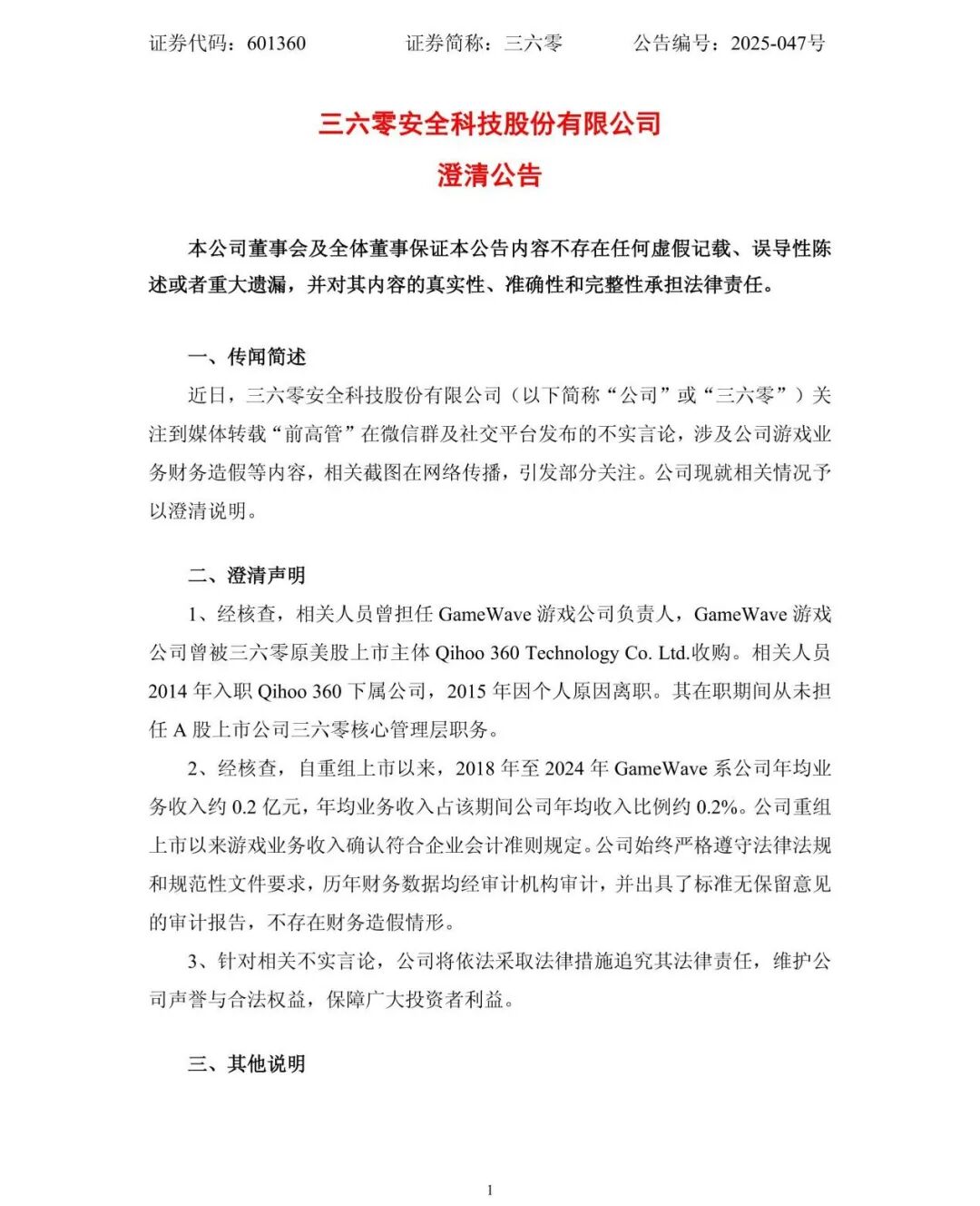 次日,三六零(以下称360)公司紧急发布公告回应称,玉红曾担任GameWave游戏公司负责人,于2014年入职360下属公司,2015年因个人原因离职,在职期间从未担任A股上市公司三六零核心管理层职务。2018年至2024年GameWave系公司年均业务收入约0.2亿元,年均业务收入占该期间公司年均收入比例约0.2%。公司重组上市以来游戏业务收入确认符合企业会计准则规定。针对相关不实言论,公司将依法采取法律措施追究其法律责任。