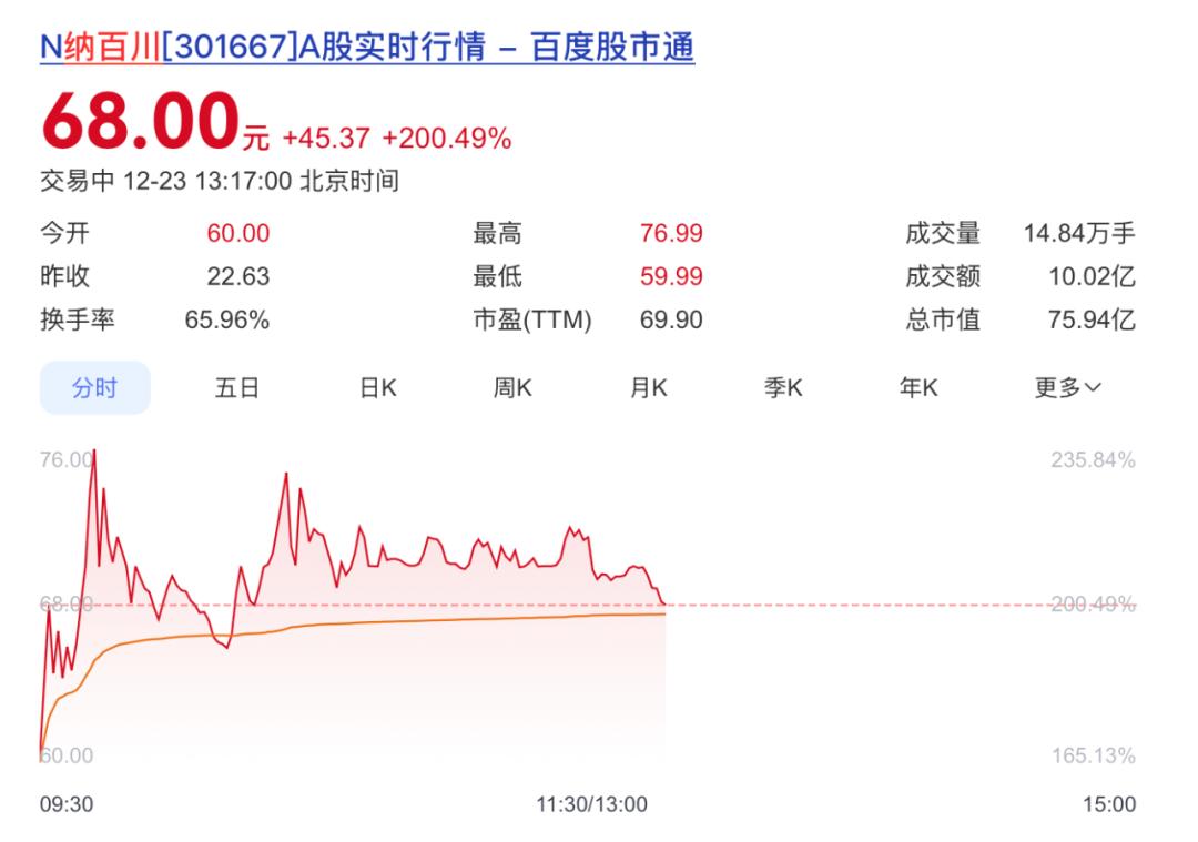 12月23日汽配企业纳百川新能源股份有限公司(下称:纳百川)正式登陆创业板。上市首日,纳百川高开165.13%报60元/股,盘中最高触及76.99元/股。