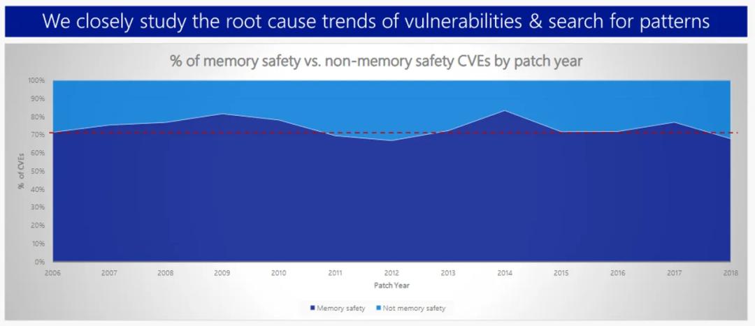以 2019 年为例,微软工程师 Matt Miller 在某安全会议上披露,过去 12 年间,微软每年通过安全更新修复的漏洞中约有 70% 属于内存安全问题。