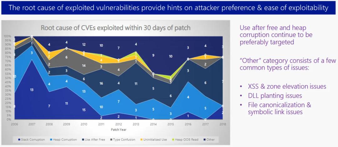如此高比例的漏洞根源在于,主要采用 C/C++ 编写的 Windows 系统建立在“内存不安全”的编程语言基础之上。这类语言虽然赋予开发者精细控制内存地址的能力,但内存管理代码中的任何细微疏忽都可能导致严重漏洞。攻击者常利用此类漏洞实施远程代码执行、权限提升等危险入侵。当前,内存安全漏洞已成为黑客最主要的攻击入口,其中释放后使用和堆损坏漏洞尤其受到攻击者青睐,成为其开发攻击程序时最常利用的突破口。