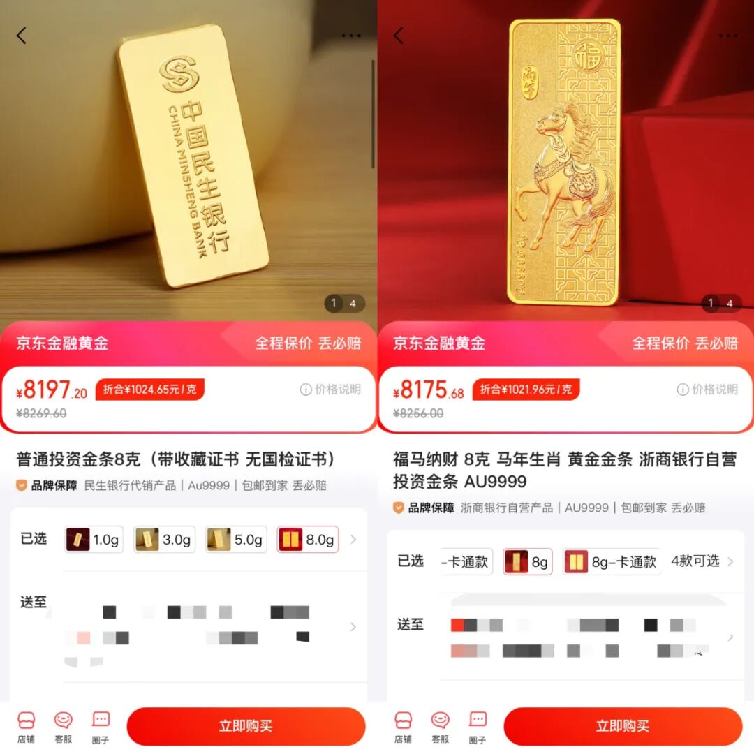 23日13时许,京东金融App显示,浙商银行马年投资金条为1021.96元/克,8克金条价格为8175.68元;民生银行普通投资金条为1024.65元/克,8克金条价格为8197.20元。