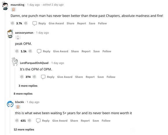 2015年播出的《一拳超人》第一季,在欧美漫画网站票选,就以47%得票率登顶最佳动画。今年更新的211话,虽然在国内评价不佳,但在X上被盛赞“best chapter”,在Reddit上,一条“一拳超人从来没有像过去这几话这么精彩过!”的评论获得了3700个赞。