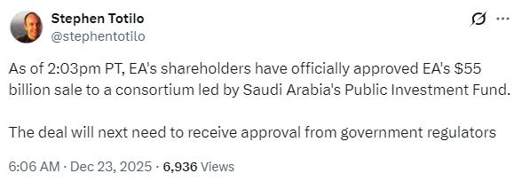 今日(12月23日),外媒游戏记者Stephen Totilo爆料表示,EA(电子艺界)的股东已经正式批准了收购案件进程,将由沙特阿拉伯公共投资基金(PIF)牵头组成的投资财团以总价550亿美元收购。该交易接下来还需要获得政府监管机构的批准。