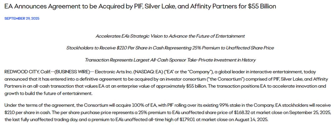 此前在今年9月29日,EA便发文表示将被PIF、Silver Lake及Affinity Partners组成的投资财团以550亿美元的价格收购。股东们将获得每股210美元的现金收益,这一金额相较于未受影响的股价而言形成了25%的溢价。消息发布后,EA股价亦上升了14.87%,目前维持在200美元左右。