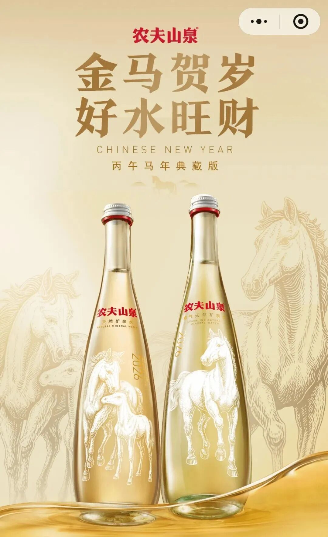 农夫山泉以“金水生财、遇水则发”的玄学知识,增加了生肖瓶收藏价值;在不同生肖年结合不同生肖的寓意进行差异化表达,比如今年推出的“2026年丙午马年生肖水”,丙午驿马主变动与革新、寓意财富与成功,这种叙事让产品超越了功能价值,强化了生肖瓶的节日仪式感和精神价值。