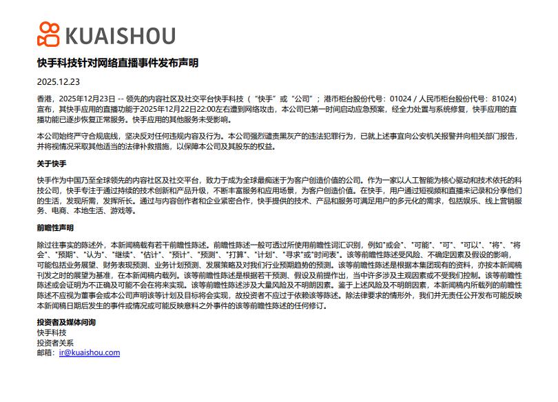 而在12月23日中午,快手发布声明称,经全力处置与系统修复,快手应用的直播功能已逐步恢复正常服务。快手应用的其他服务未受影响。公司始终严守合规底线,坚决反对任何违规内容及行为。本公司强烈谴责黑灰产的违法犯罪行为,已就上述事宜向公安机关报警并向相关部门报告,并将视情况采取其他适当的法律补救措施,以保障本公司及其股东的权益。