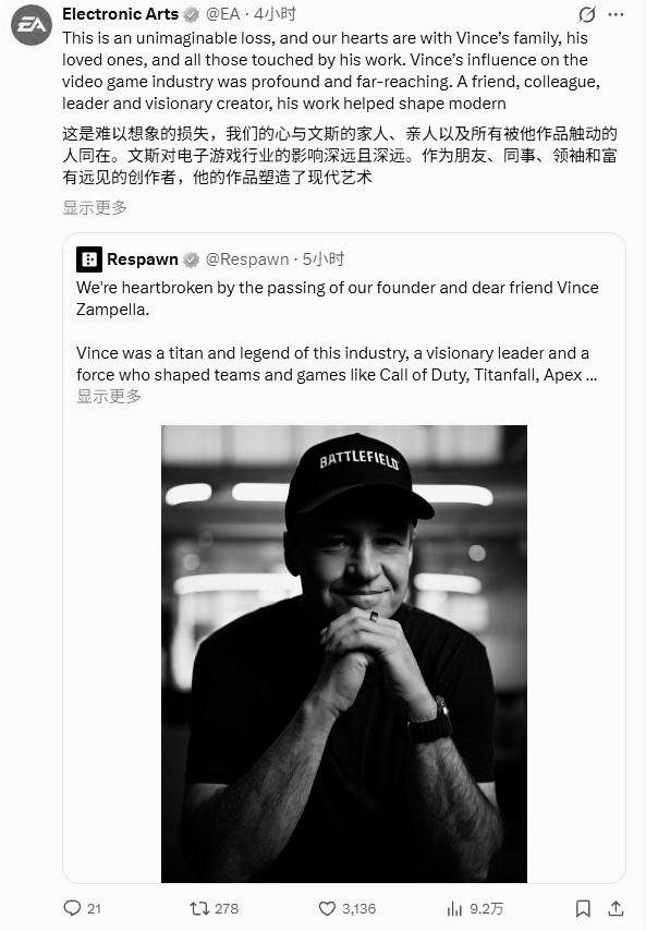 艺电公司22日发表声明称:“这是难以想象的损失,我们向文斯的家人、挚爱以及所有受他作品影响的人们致以最深切的慰问。文斯对电子游戏行业的影响深远而广泛。”