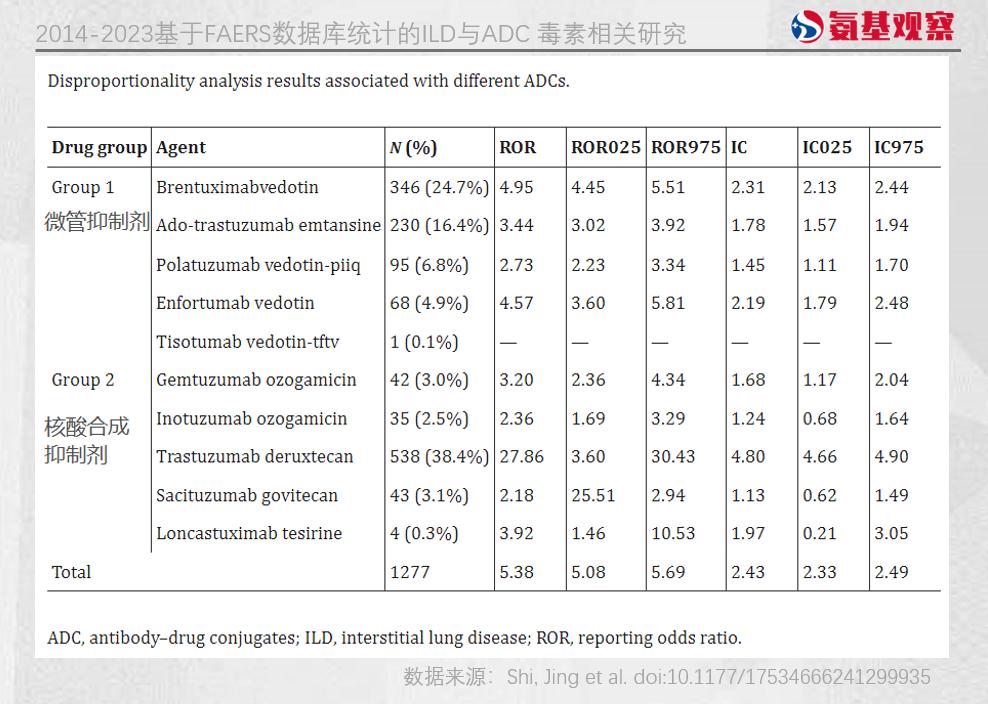 当然,Dxd毒素不是ADC触发ILD的唯一药物载荷。最新研究汇总了真实临床中ADC触发的ILD结果,并根据毒素类型进行划分,可见Brentuximab vedotin、Enhertu各位代表ALD与ILD发生相关性极高,而前者毒素为MMAE。