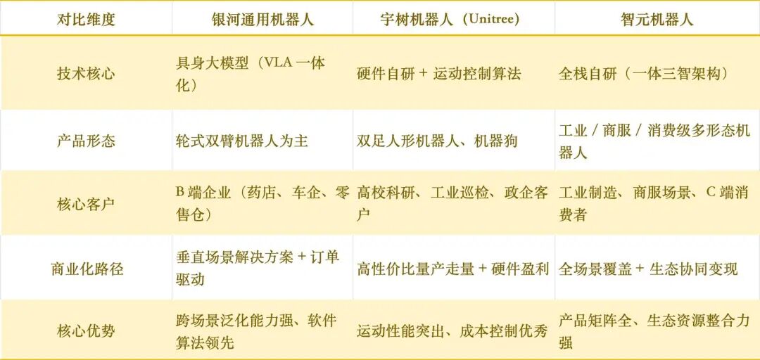 在这样的背景下,头部公司的分化开始显现。在国内具身智能第一梯队中,银河通用机器人、宇树科技、智元机器人同属领先阵营,但三家公司对“通用机器人的核心能力”理解不同,走出的技术路径也不一样。