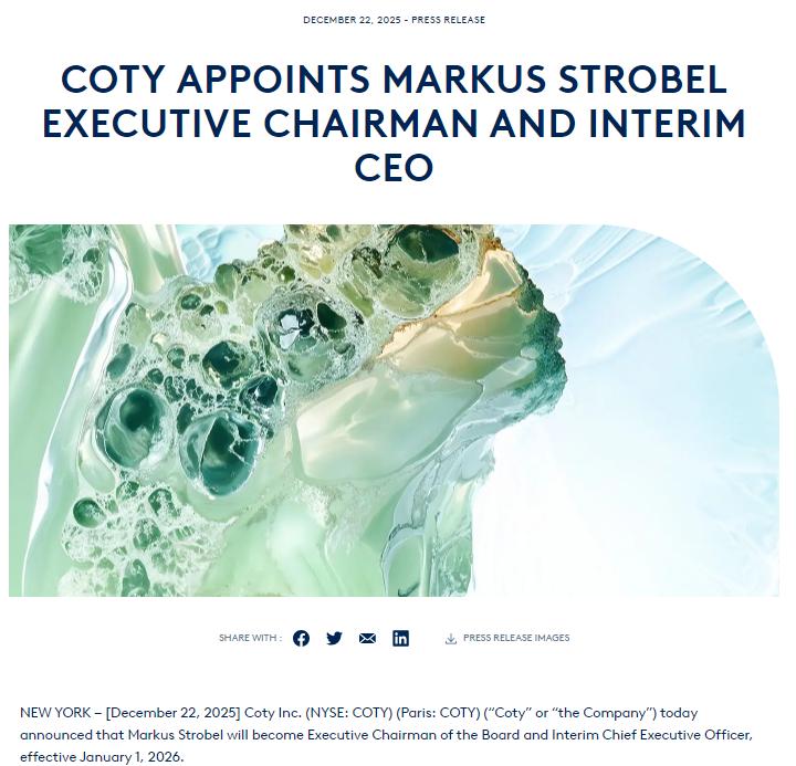 当地时间12月22日,科蒂集团在官网发布一则人事变动公告,称已任命Markus Strobel(中文名:马库斯·斯特罗贝尔)担任董事会执行主席兼临时首席执行官,自2026年1月1日起生效。