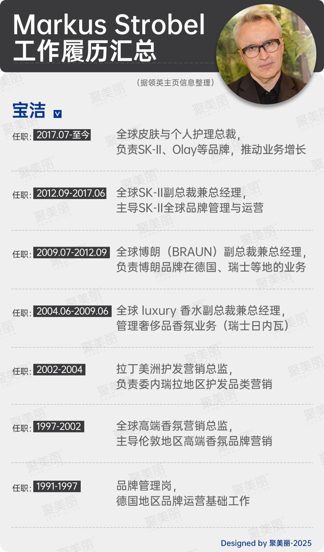 该公告表示,Markus Strobel 拥有33年宝洁任职履历,离任前担任宝洁全球皮肤及个人护理业务总裁,执掌十余个全球品牌、数十亿美元规模的业务板块。他因推动宝洁美容业务转型、重塑SK-II为亚洲高端护肤标杆享誉行业,历任香水、护发等多品类高管岗位,主导古驰、杜嘉班纳等奢品香水业务,并牵头完成欧美及大中华区等核心市场的研发、供应链与营销体系现代化升级。