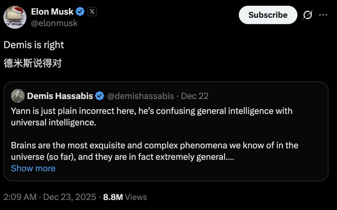 马斯克转帖并站队Hassabis,认为他说得完全正确。
