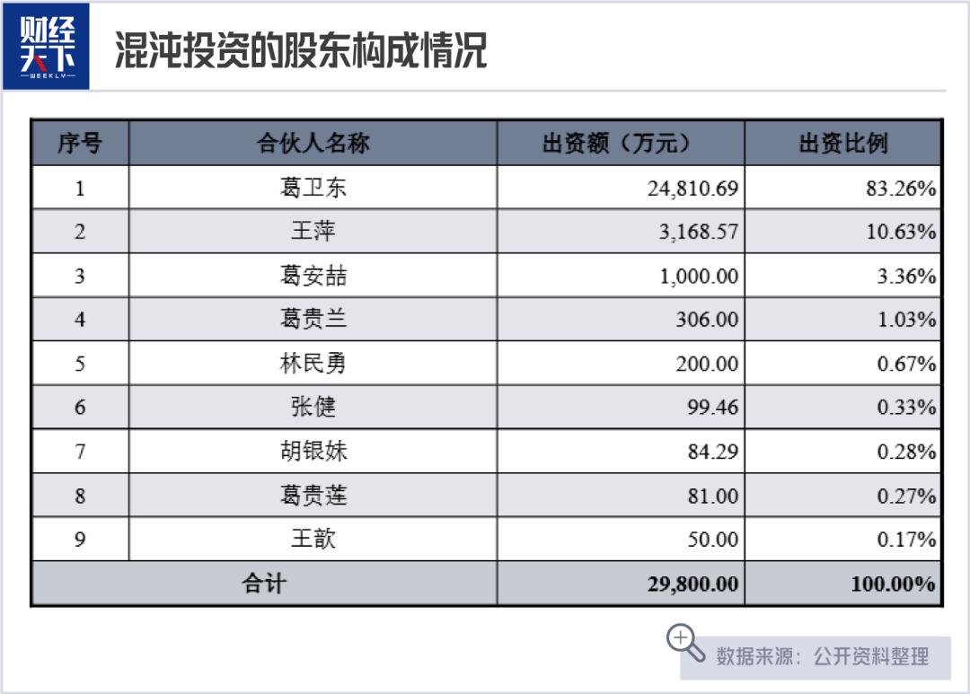 混沌投资股东结构中,葛卫东本人持股 83.26%,妻子王萍、儿子葛安喆、姐姐葛贵兰等亲属分别持股10.63%、3.36%、1.03%。