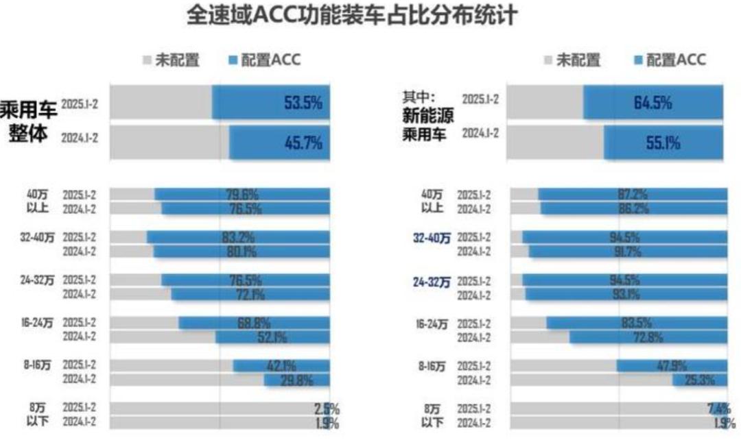 也是因此,根据乘联会的数据,如今市面上的新车 ACC 功能的搭载率已经达到了 57.5% ,如果把范围缩小到新能源车,搭载率更是去到了 71.6% 。