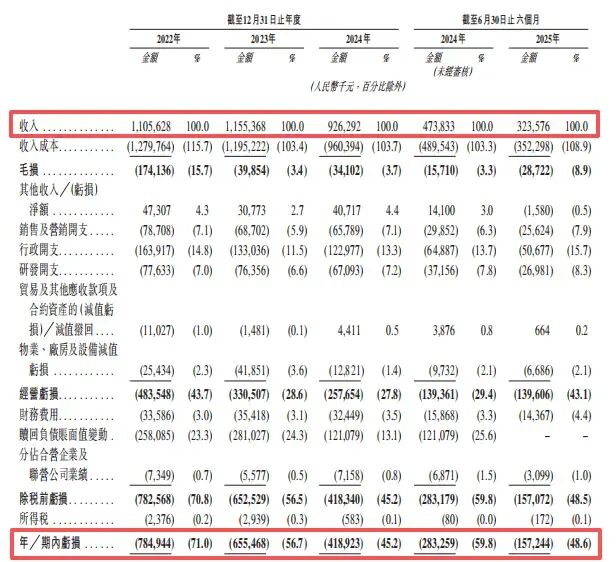 招股说明书显示,2022年、2023年、2024年以及2025年上半年,公司的净亏损分别为7.85亿元、6.55亿元、4.19亿元及1.57亿元。