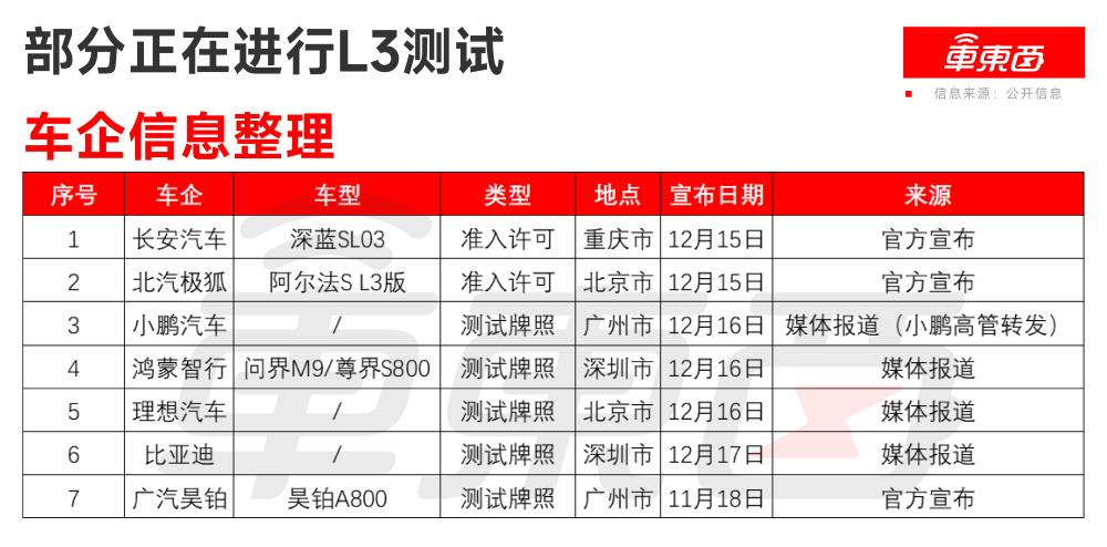 在12月15日工信部发布公告后,陆续有多家车企传出L3测试相关的消息。