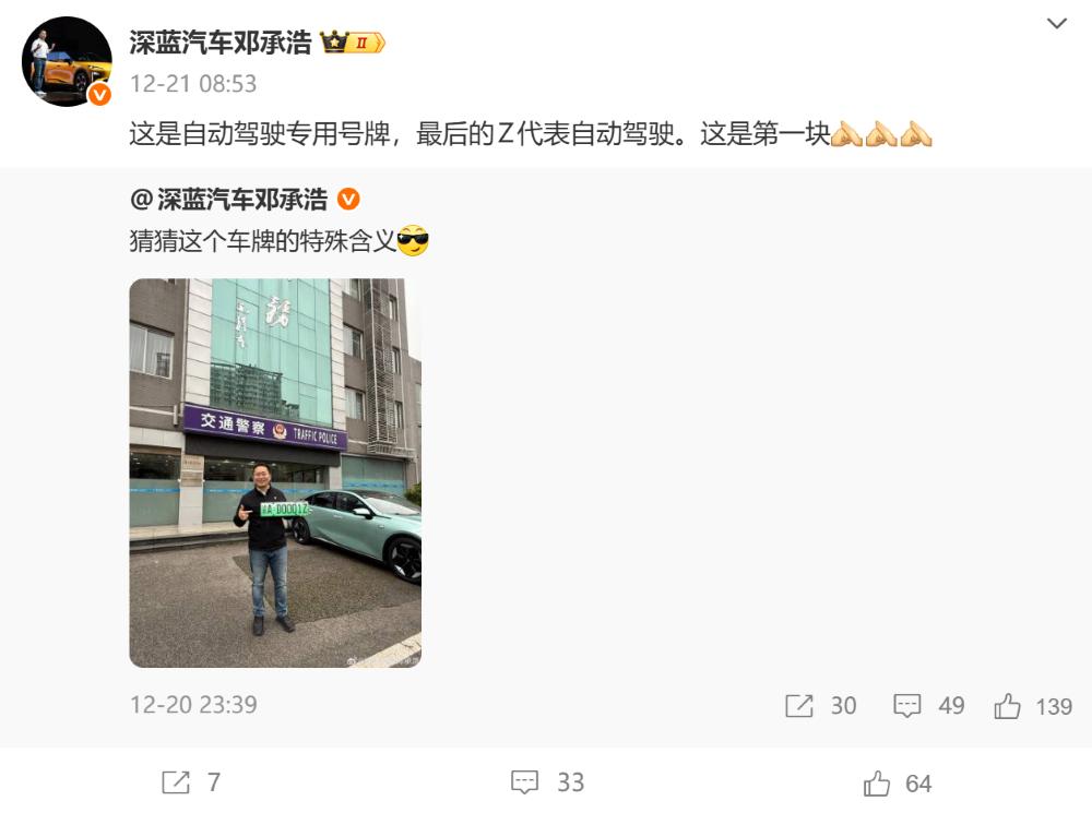 就在几天前,深蓝汽车董事长邓承浩在社交媒体上发文表示,深蓝汽车获得了自动驾驶专用号牌“渝AD0001Z”,邓承浩还提到牌照最后的“Z”代表自动驾驶,并称这是“第一块”。