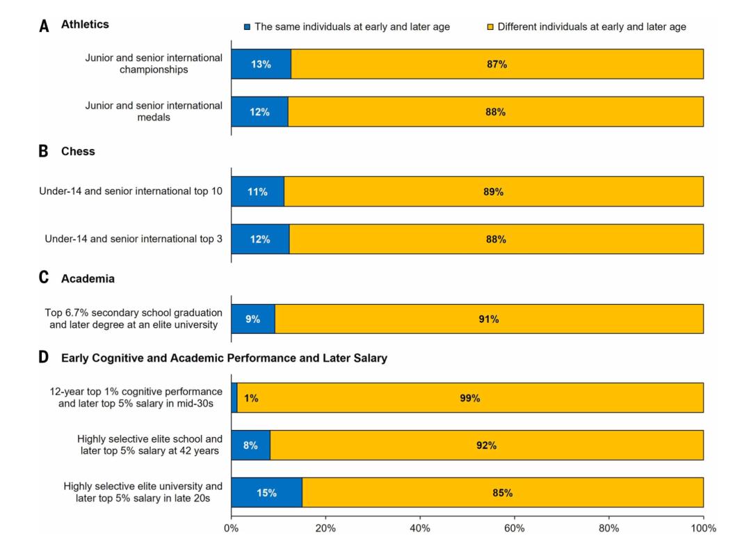 研究表明年轻时的顶尖者和成年后的顶尖者不是同一批人,但这其实是意料之中的,因为非精英的年轻候选人基数本来就大得多。