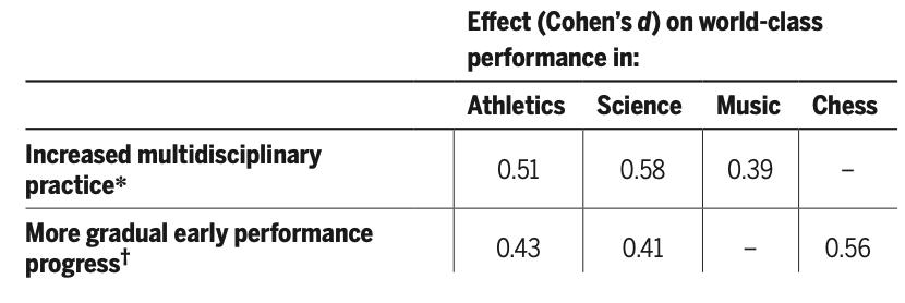 研究者用元分析汇总了跨学科实践和早期缓慢进步对世界级成就的效应量,发现无论是在体育、科学还是音乐领域,这些效应量的大小和方向都高度一致(Cohen’s d = 0.39到0.58),且不同领域之间的差异不具有统计显著性。
