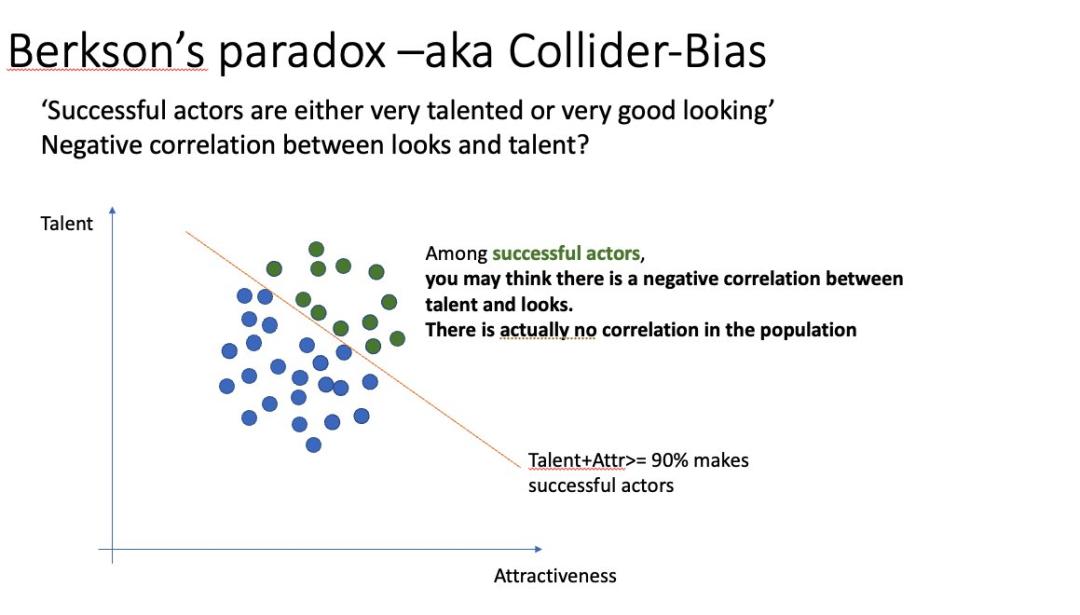 第二个更微妙的问题是伯克森悖论(Berkson’s paradox),也叫对撞偏差(Collider Bias)。
