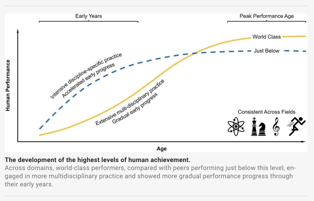 在多个领域的实践经验会增加一个人找到最适合自己天赋和偏好的领域的概率,而找到“最优匹配”的人更有可能最终达到顶尖水平。